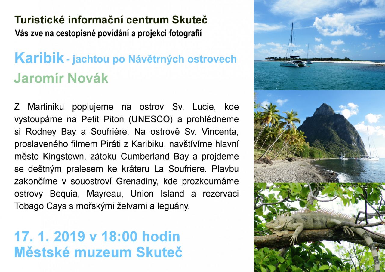 S cestovatelem Jaromírem Novákem prožijeme plavbu z Martiniku na ostrovy Sv. Lucie a Sv. Vincent a souostroví Grenadiny. Poznáme přírodní dominantu Petit Piton zapsanou do seznamu světového dědictví UNESCO, rezervaci Tobago Cays s mořskými želvami a leguány i místo, kde se natáčeli Piráti z Karibiku.