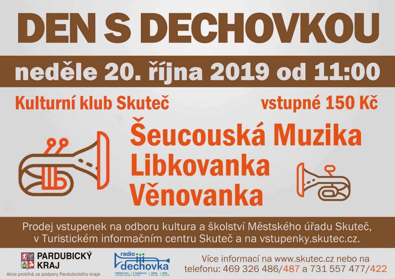 Jedna podzimní neděle ve Skutči vždy patří dechové hudbě. V Kulturním klubu Skuteč se uskuteční již XII. Den s dechovkou. Kromě domácí Šeucouské Muziky se můžete těšit na Věnovanku a Libkovanku.