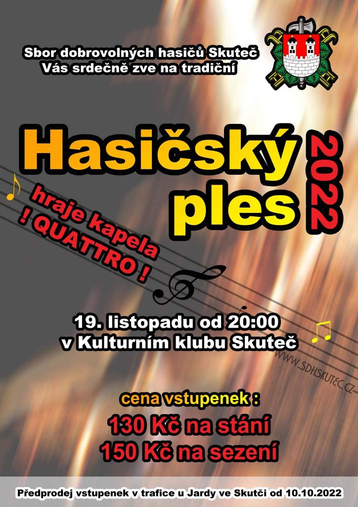 SDH Skuteč vás zve na svůj ples, kde k tanci i poslechu zahraje kapela Quattro. Předprodej vstupenek probíhá v Trafice u Jardy na Palackého náměstí.
