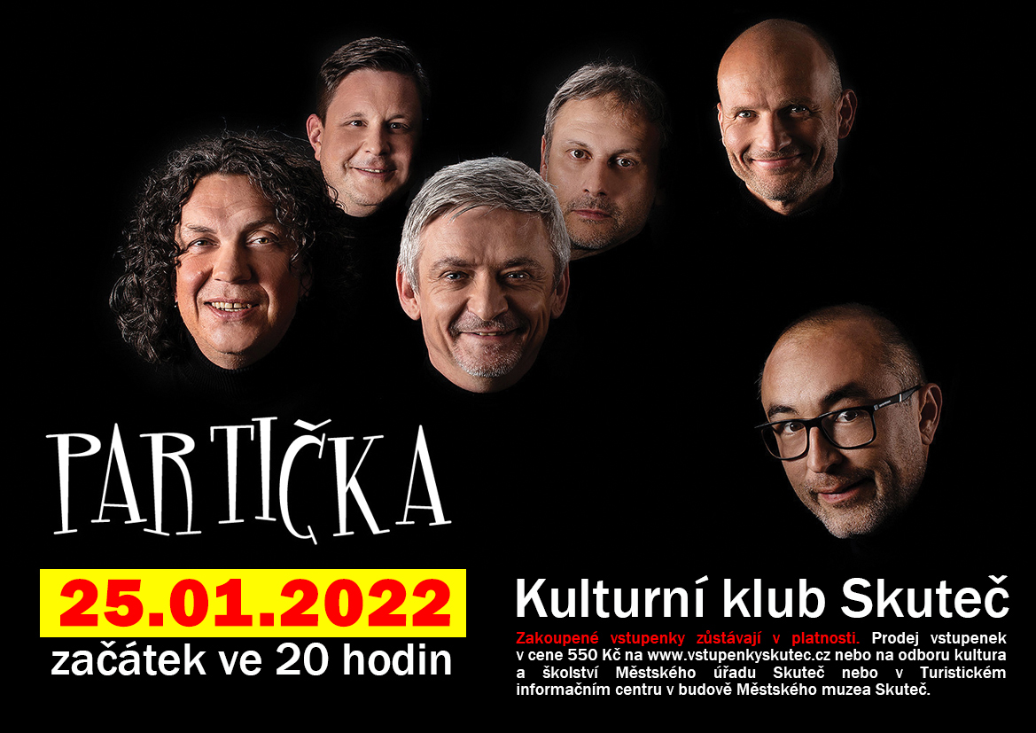 Oblíbená Partička se opět představí ve Skutči. Už popáté. V přesunutém termínu v úterý 25. ledna 2022 se Michal Suchánek, Igor Chmela, Richard Genzer, Michal Novotný a Marian Čurko předvedou se svou improvizační show.
