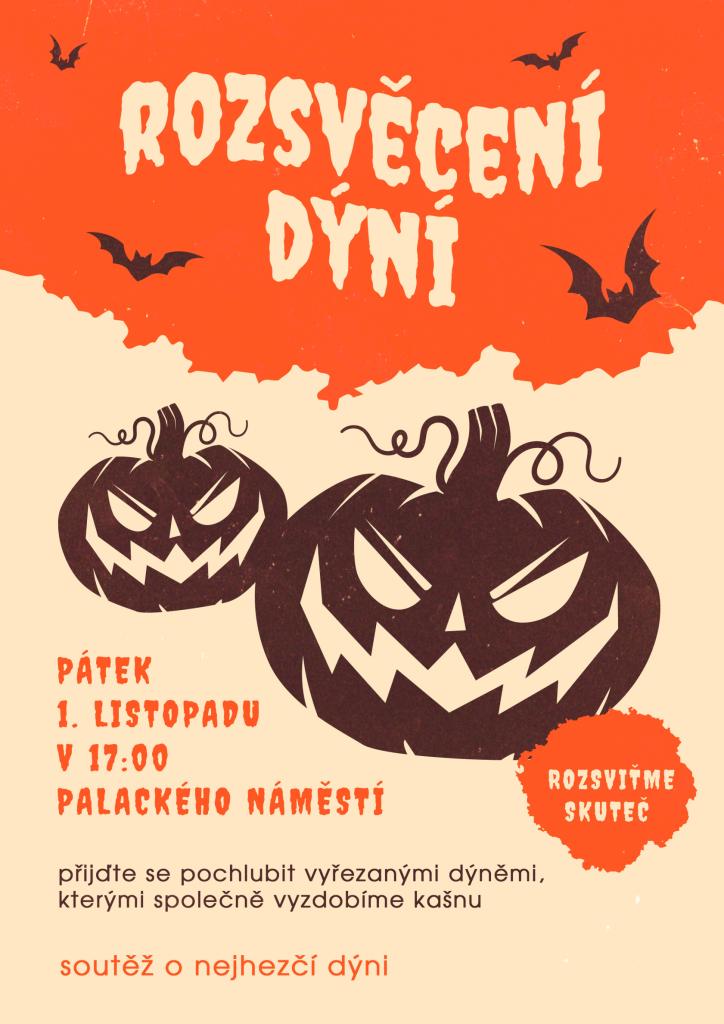 Na pátek 1. listopadu opět plánujeme Rozsvěcení dýní. Přijďte se od 17 hodin pochlubit vyřezanými dýněmi, kterými společně vyzdobíme kašnu. Připravena bude také soutěž o nejhezčí dýni.