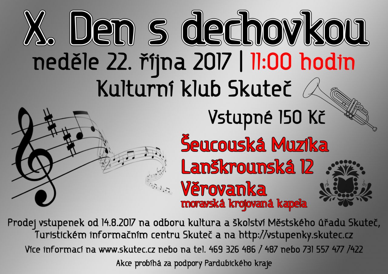 V neděli 22. října 2017 se v Kulturním klubu Skuteč uskuteční jubilejní X. Den s dechovkou. Na oslavu tohoto výročí nám přijede zahrát, kromě domácí Šeucouské Muziky také Lanškrounská 12 a moravská krojovaná kapela Věrovanka.
