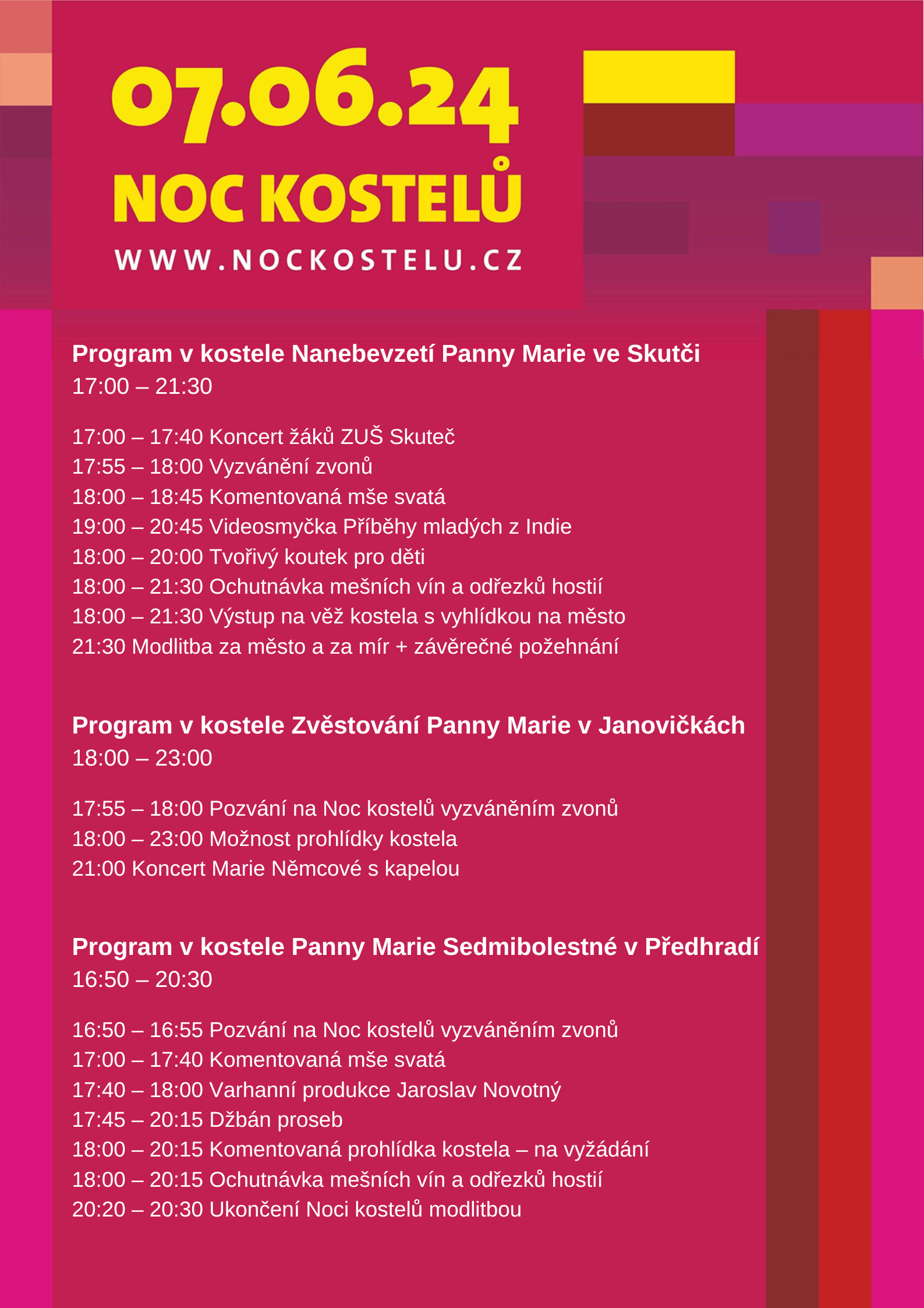 V pátek 7. června můžete zajít na další Noc kostelů. Program je připraven v kostele Nanebevzetí Panny Marie na náměstí ve Skutči, v kostele v Předhradí nebo v Janovičkách.