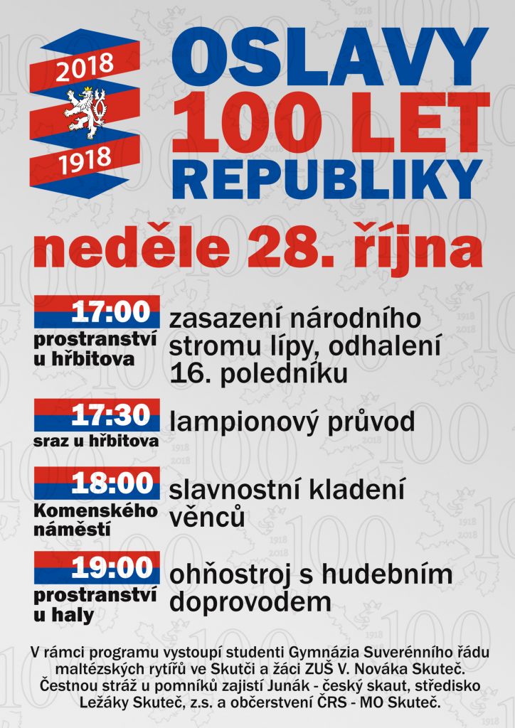 V neděli 28. října 2018 uplyne 100 let od vzniku samostatného Československa. Toto významné výročí se bude slavit po celé republice a Skuteč nezůstane pozadu. Již v 17 hodin se sejdeme na prostranství u hřbitova, kde společně se skauty zasadíme Strom svobody. Následně odhalíme 16. poledník, po kterém pátrali studenti Gymnázia Suverénního řádu maltézských rytířů ve Skutči.