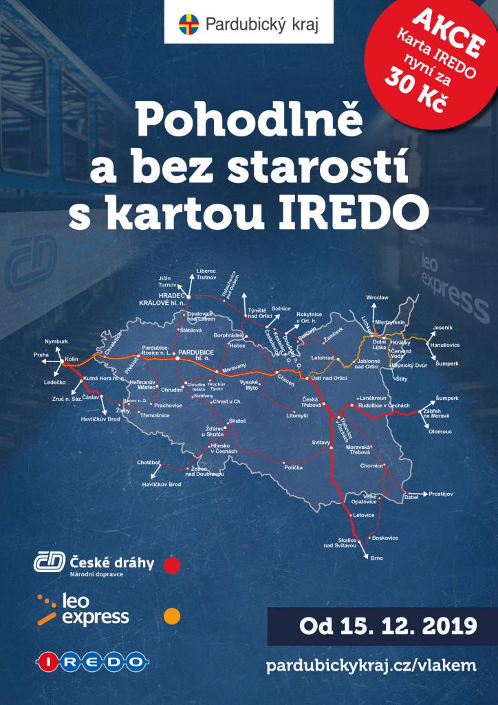 „Kartu IREDO, která platí v rámci cestování v našem a Královéhradeckém kraji, využívají především pravidelní cestující do práce, školy či k lékaři. Chceme v rámci nového jízdního řádu a fungování dvou dopravců co nejvíce usnadnit cestování především v rámci přestupu z Českých drah na LeoExpress a obráceně, ke kterému bude docházet v Ústí nad Orlicí. Namísto současných 150 korun zavádíme akční cenu 30 korun, což je de facto jedno pivo. Díky této kartě si cestující v nástupní stanici zakoupí jízdenku i mezi dopravci, a to jak železničními, tak autobusovými bez jakýchkoliv dalších povinností,“ uvedl hejtman Martin Netolický s tím, že sleva bude platná od 1. prosince do 30. ledna na všech výdejních místech v Pardubickém kraji.