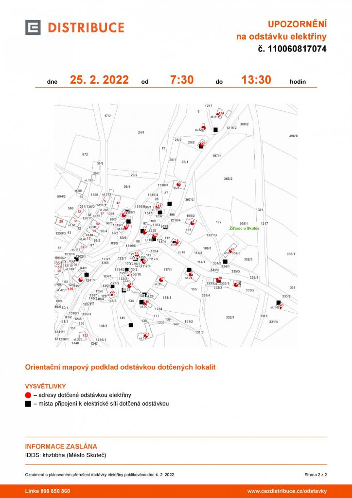 V pátek 25. února od 7:30 do 13:30 bude přerušena dodávka elektrické energie v místní části Žďárec u Skutče. Přesný rozpis naleznete níže.