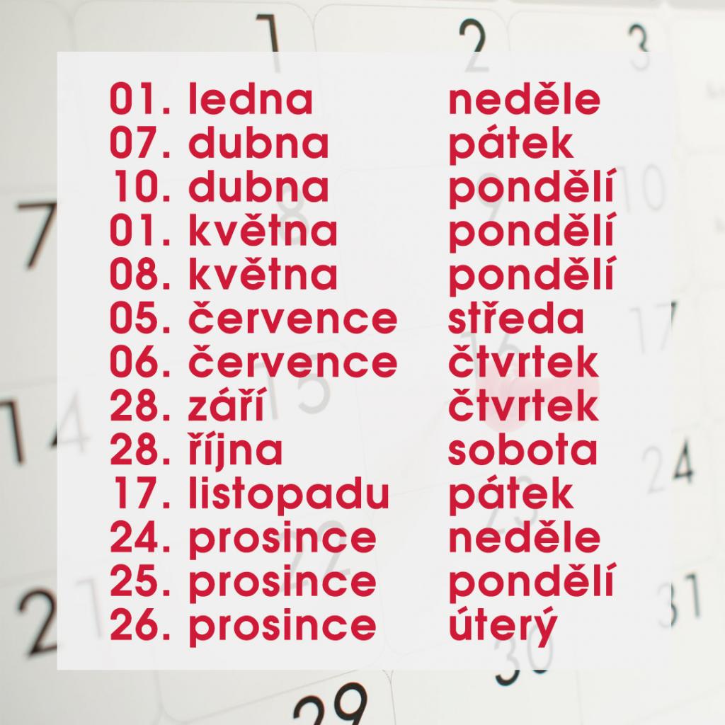 Dle zákona 223/2016 Sb. musí být vybrané obchody v určité státní svátky uzavřeny. Takovéto dny jsou v přehledu označeny znakem ●.