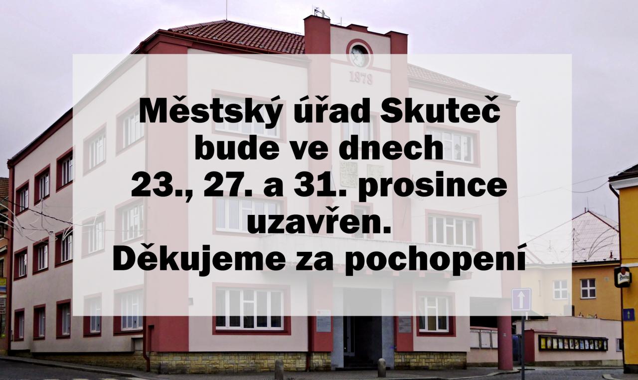 Městský úřad Skuteč bude ve dnech 23., 27. a 31. prosince 2019 uzavřen. Děkujeme za pochopení.